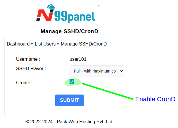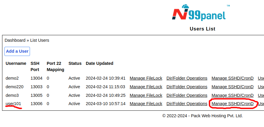 Step 2 : You will see the list of all the users. Please click 'Manage SSHD/CronD' link against the appropriate user