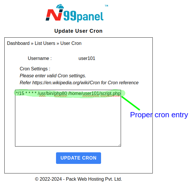 Step 5 : Now enter proper valid cron entries. If a line is long, it may wrap and that may seems there are two lines. But each cron entry has to be without a line-break. We advise that you create the cron entries in your favorite text editor, and just copy/paste the same over here.