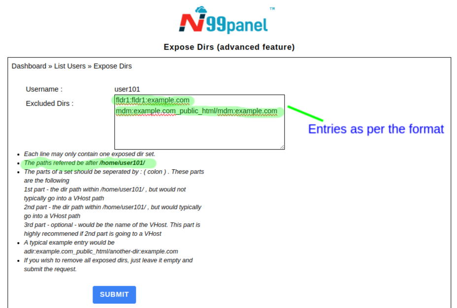 The PHP code is not able to access the folders above this path i.e. it will not be able to access /home/user101/fldr1 nor it will be able to access /home/user101 . This scenario is indeed desired as a matter of security practices. But if you wish to use /home/user101/fldr1 , you can use it via the 'expose dir' feature under N99panel