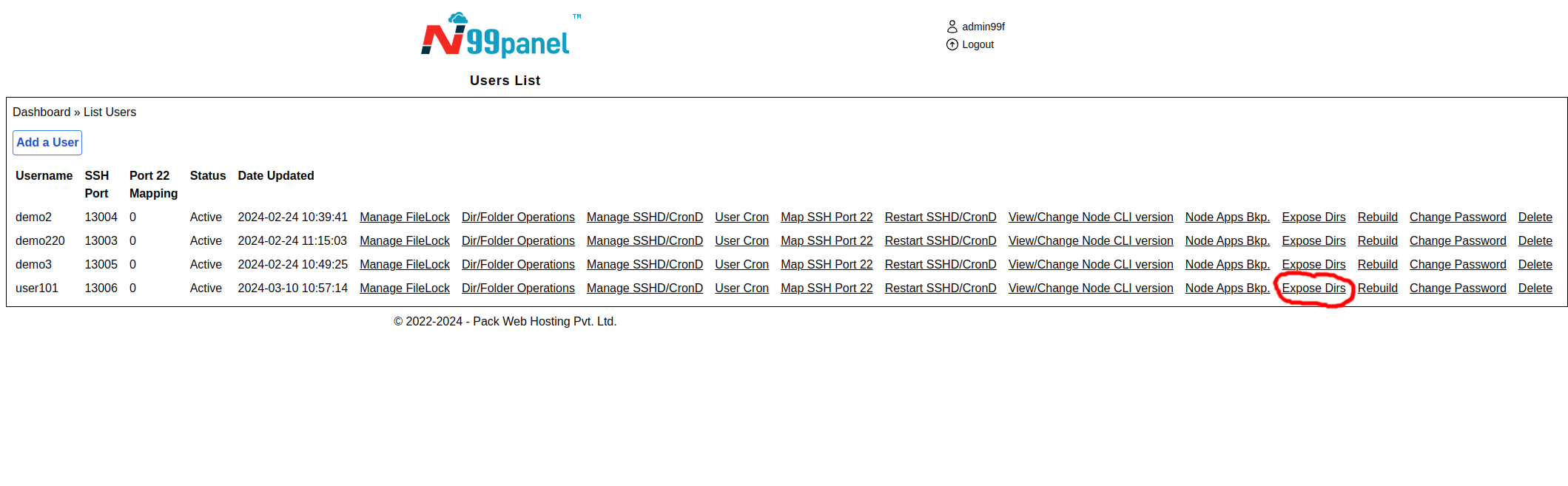 Step 2 : You will see the list of all the users. Please click 'Expose Dirs' link against the appropriate user