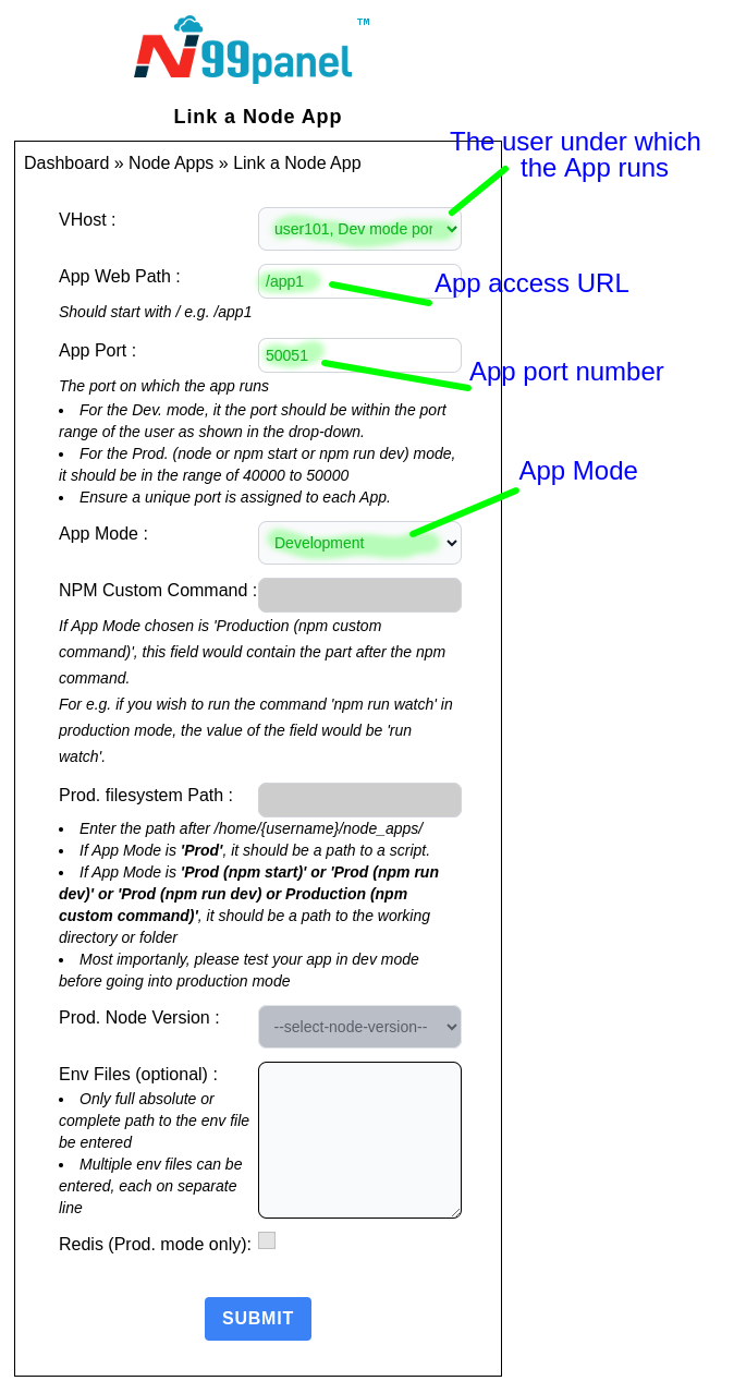 To run the app, we should first ensure that the NodeJS source file creates the Node server at the ‘App Port’ number as specified earlier. We’ll explain further via example Let’s say the user port range is 50051 to 50060 , and the port we entered under ‘App Port’ is 50051 Now my app file is say app.js . In my app.js I would need to create the server on port 50051 . To now actually run the app, we just need to type
