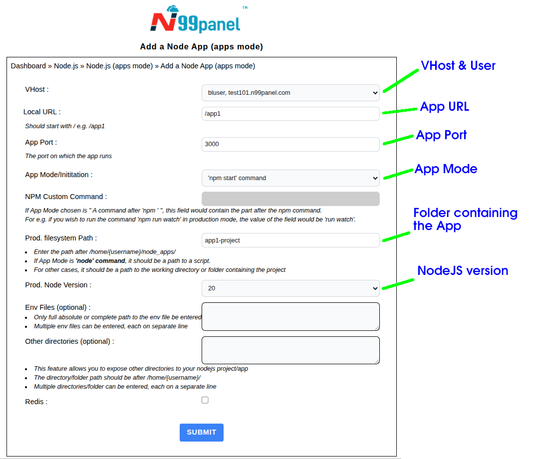 - Under the Production filesystem path, enter the folder containing the app w.r.t. /home/{username}/node_apps/ . So in our case it is app1 with App mode/initiation set to 'npm start' . But if our app had to be initiated via node command, then production filesystem path will be app1-project/index.js