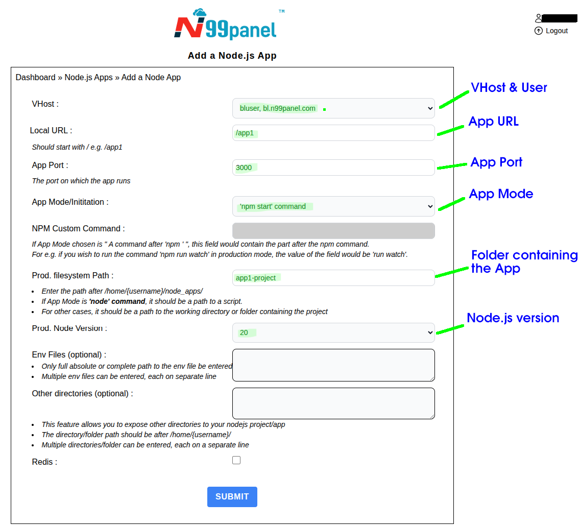 - Under the Production filesystem path, enter the folder containing the app w.r.t. /home/{username}/node_apps/ . So in our case it is app1 with App mode/initiation set to 'npm start' . But if our app had to be initiated via node command, then production filesystem path will be app1-project/index.js