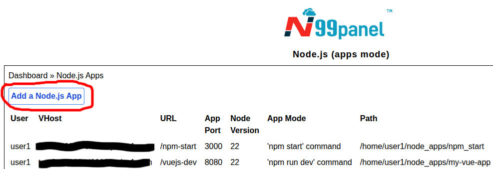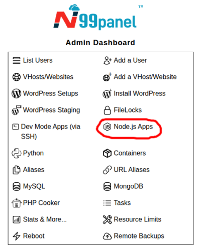 Step 1 : Log into N99panel. From under N99panel dashboard, click 'Node.js Apps'