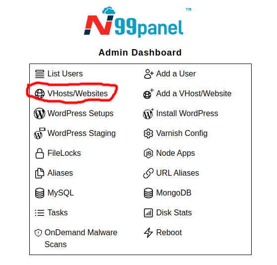 Step 5 : Now under N99panel dashboard, click on 'VHosts/Websites'