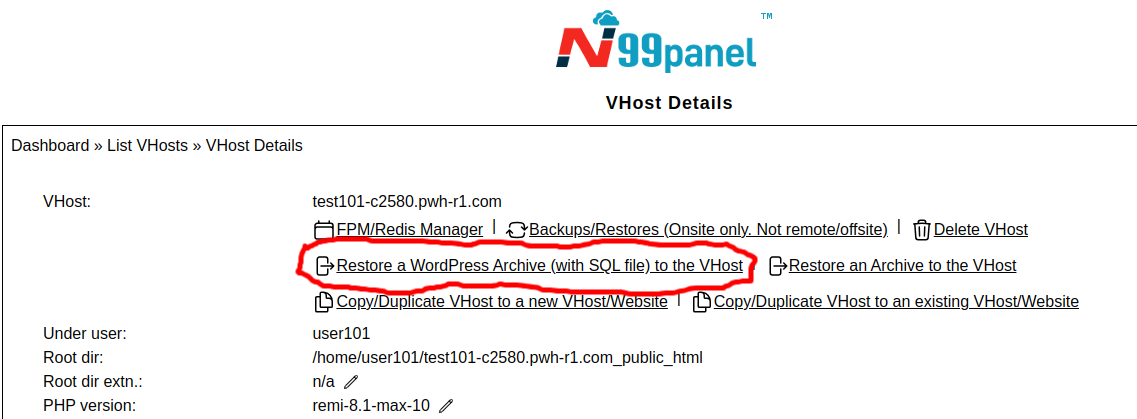 Step 7 : Now click on ‘Restore a WordPress Archive (with SQL file) to the VHost’ .