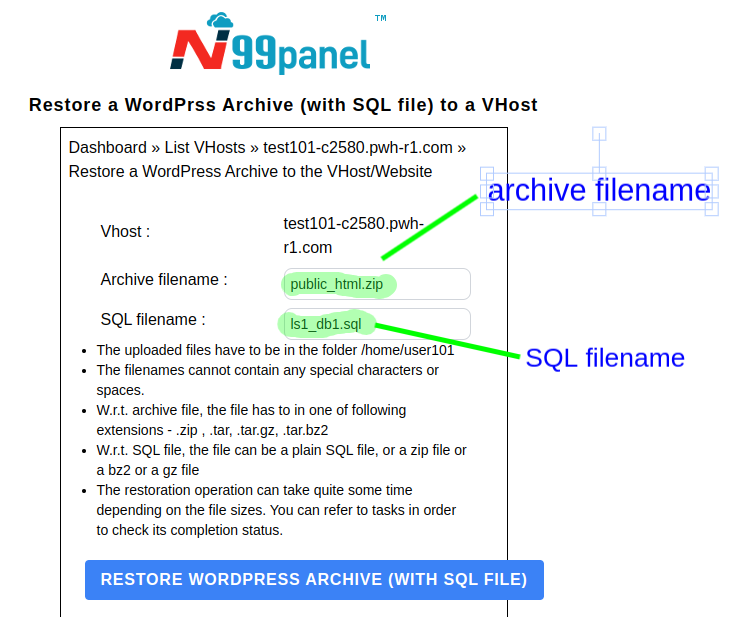 Step 8 : Now you would be prompted to enter the uploaded archive file name and the SQL file name. Submit the details and rest everything will be automated.